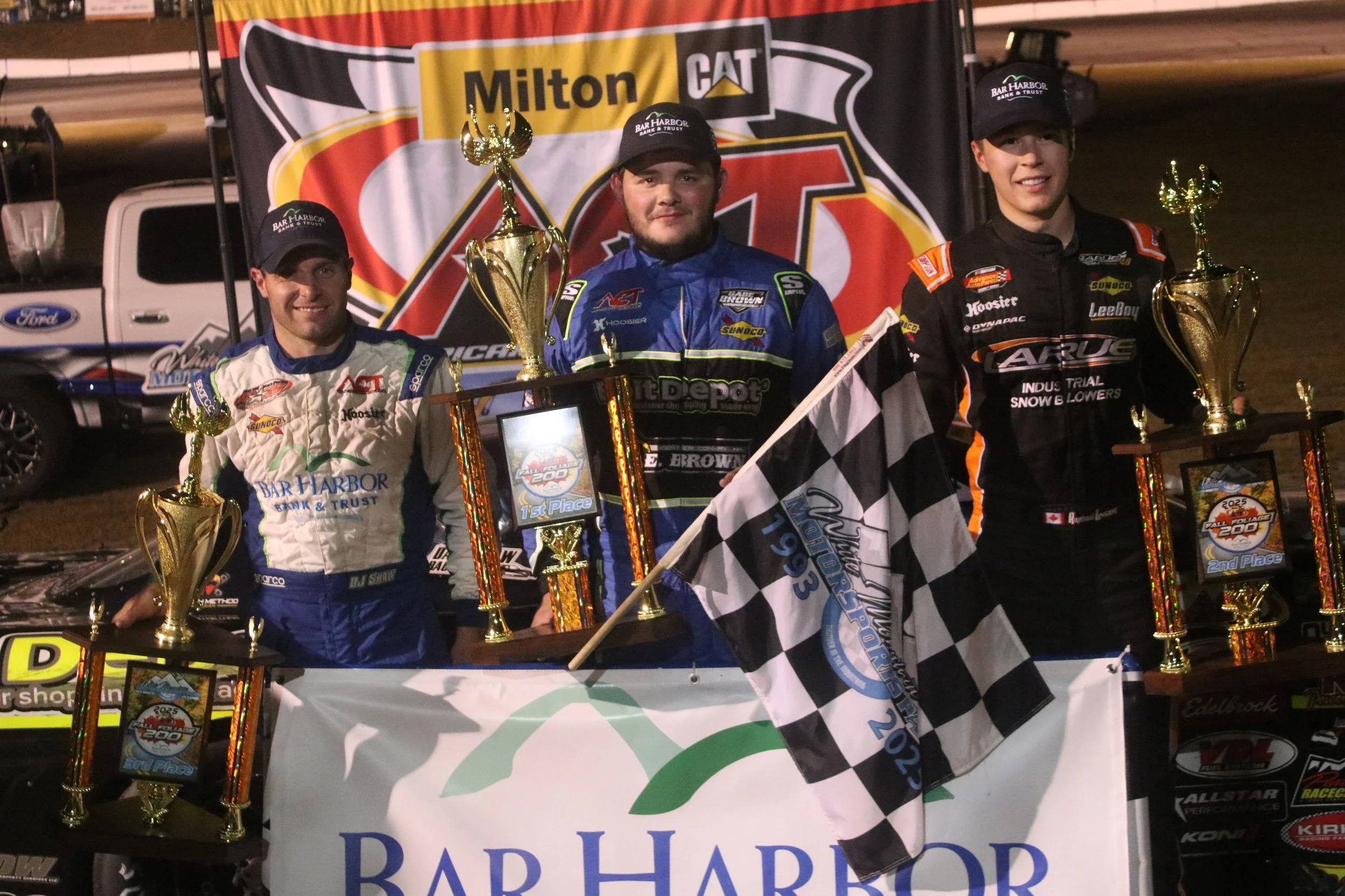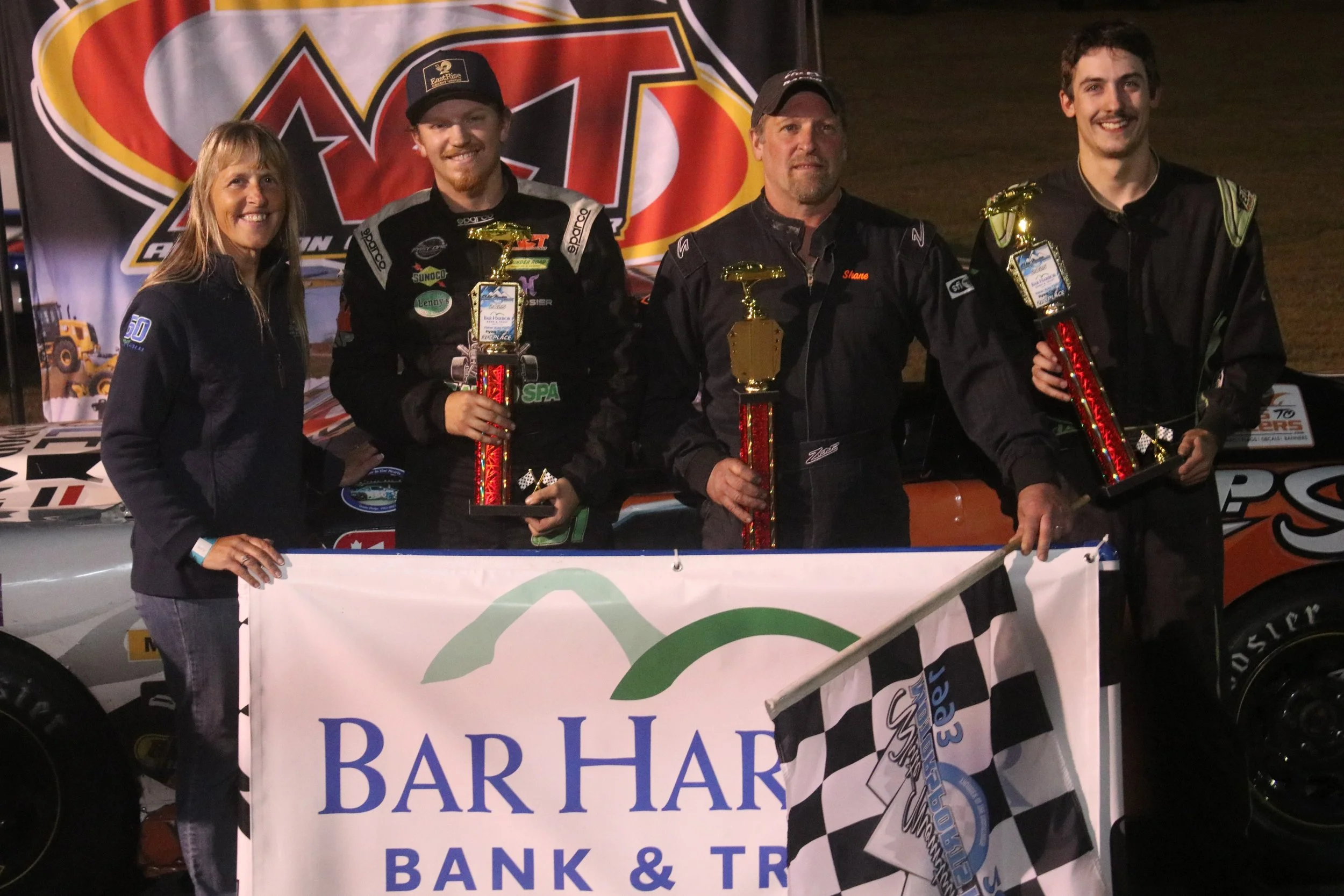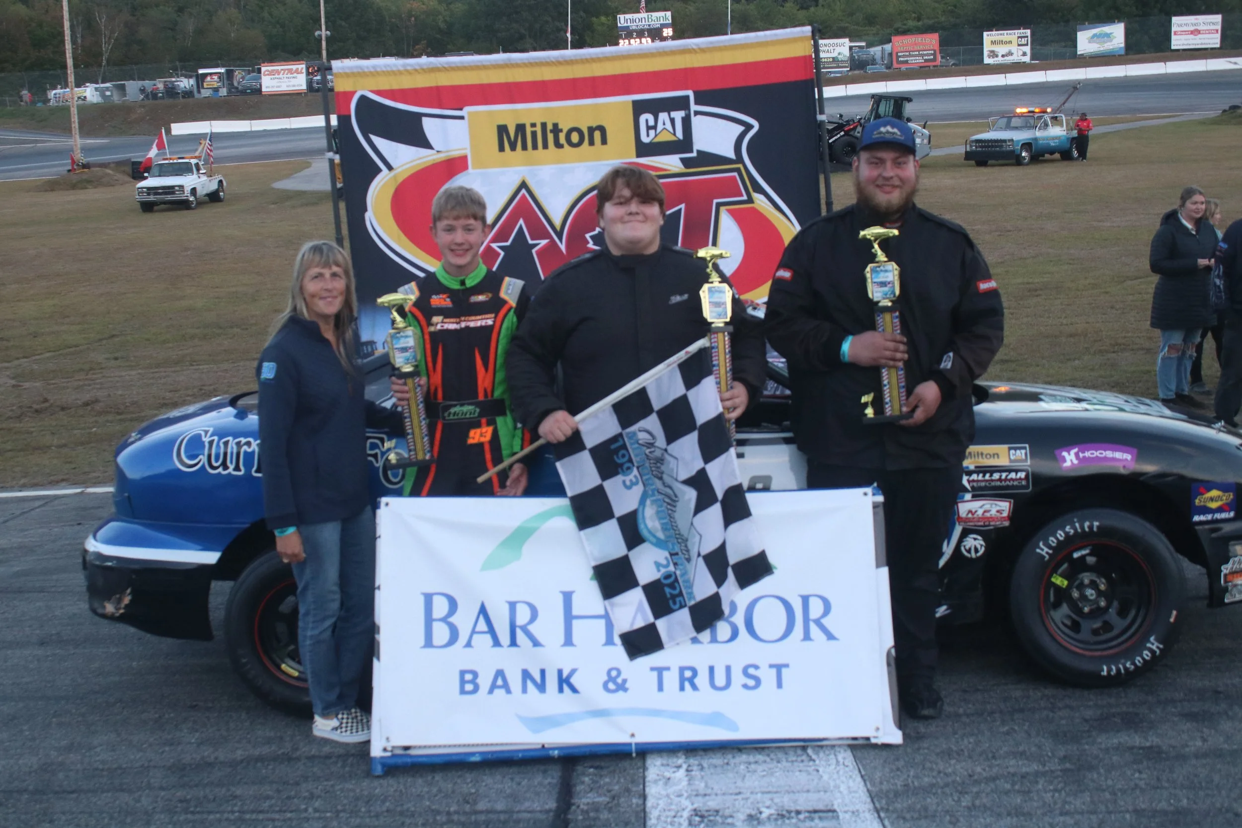 Lessard led until just after the fuel-only competition caution on lap 55 when defending Bar Harbor Bank & Trust Fall Foliage champion Gabe Brown took control and never relinquished it. The Center Conway driver lambasted the field, lapping all the way back to fifth on the grid and took down his second consecutive Fall Foliage 200 win with Lessard and D.J. Shaw in tow. What initially looked like a Shaw championship for the Brookside Equipment Triple Crown, Derek Gluchacki’s fourth place finish netted a tie between the two! Gluchacki’s win at Seekonk Speedway back in June became the tie-breaker with the former Wall’s Ford Platinum champion taking the laurels after a hard-fought top-five finish on the night.