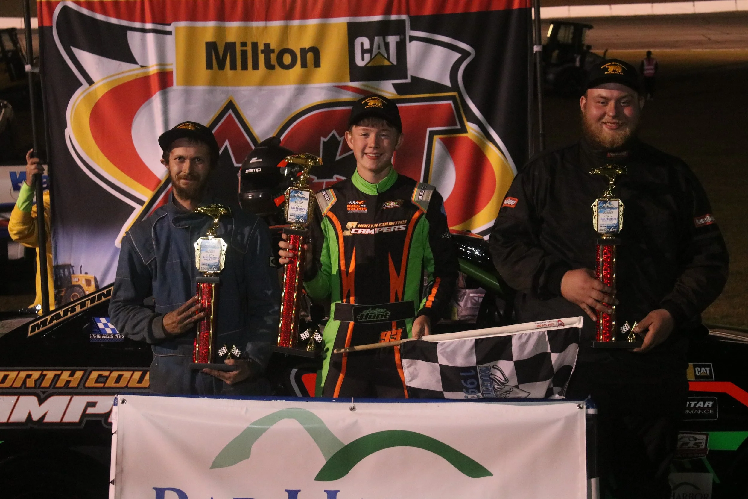 The Dad’s 4 By Tool & Supply Kids Division got Saturday’s feature racing under way with Makenzi Sicard and Kiptyn Aldrich leading the show before Chloe Doyle and Madison Potter ended up in the mix for all lady top three. After a stretch of caution flags, Owen Dupuis entered the picture on lap eight and had the lead by lap 11 over Sicard before a big turn two pileup claimed several cars. Dupuis kept his nose clean out front followed across the line by Bella Hamel and Chloe Doyle.