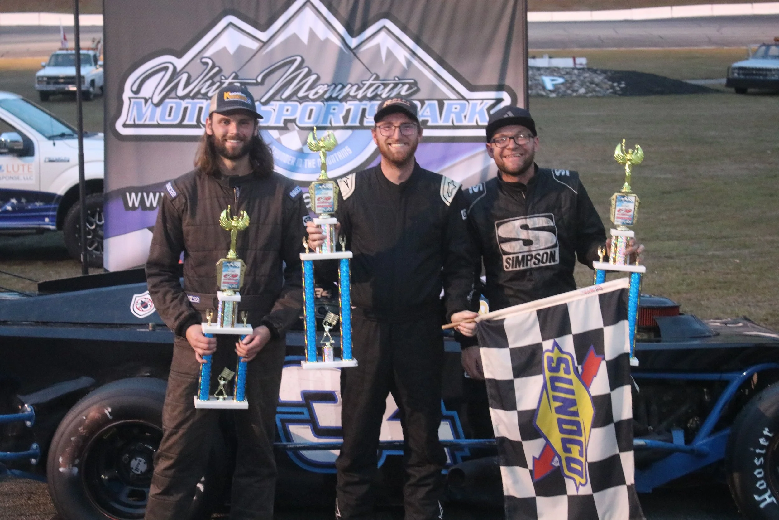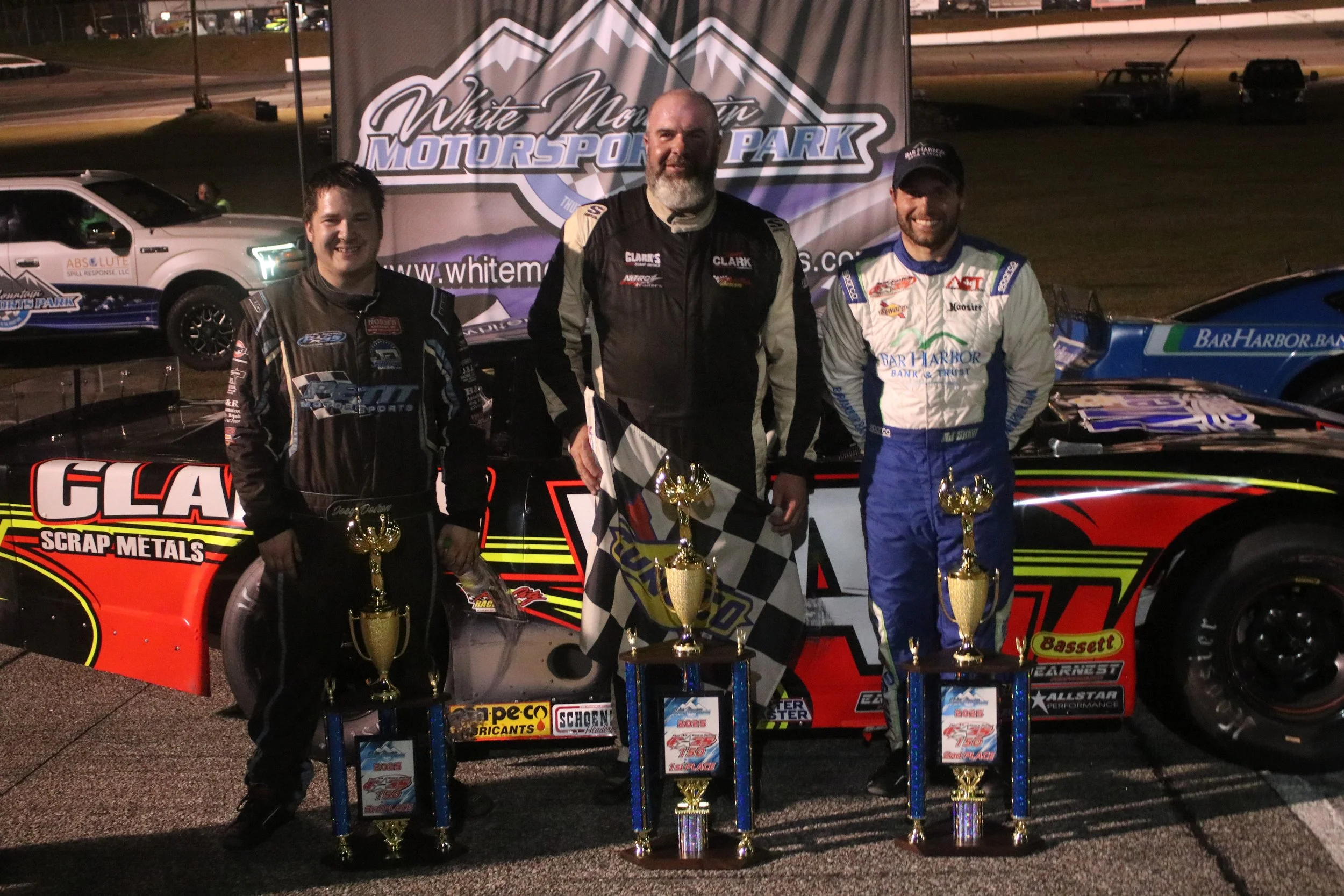 After running around the White Mountain quarter mile, Hebert and Gabe Brown made contact in turn four, sending both slam-banging into the infield to call out the lap 107 caution. On the restart, Shaw and Doiron went to war at the front of the pack right before another caution for the spinning Pat Corbett and Mike Scorzelli in turn one. The restart set up a final twenty-five lap dash between Shaw and Johnny Clark with Clark launching into the lead and never looked back to take the $7,000 win over Shaw and Joey Doiron.