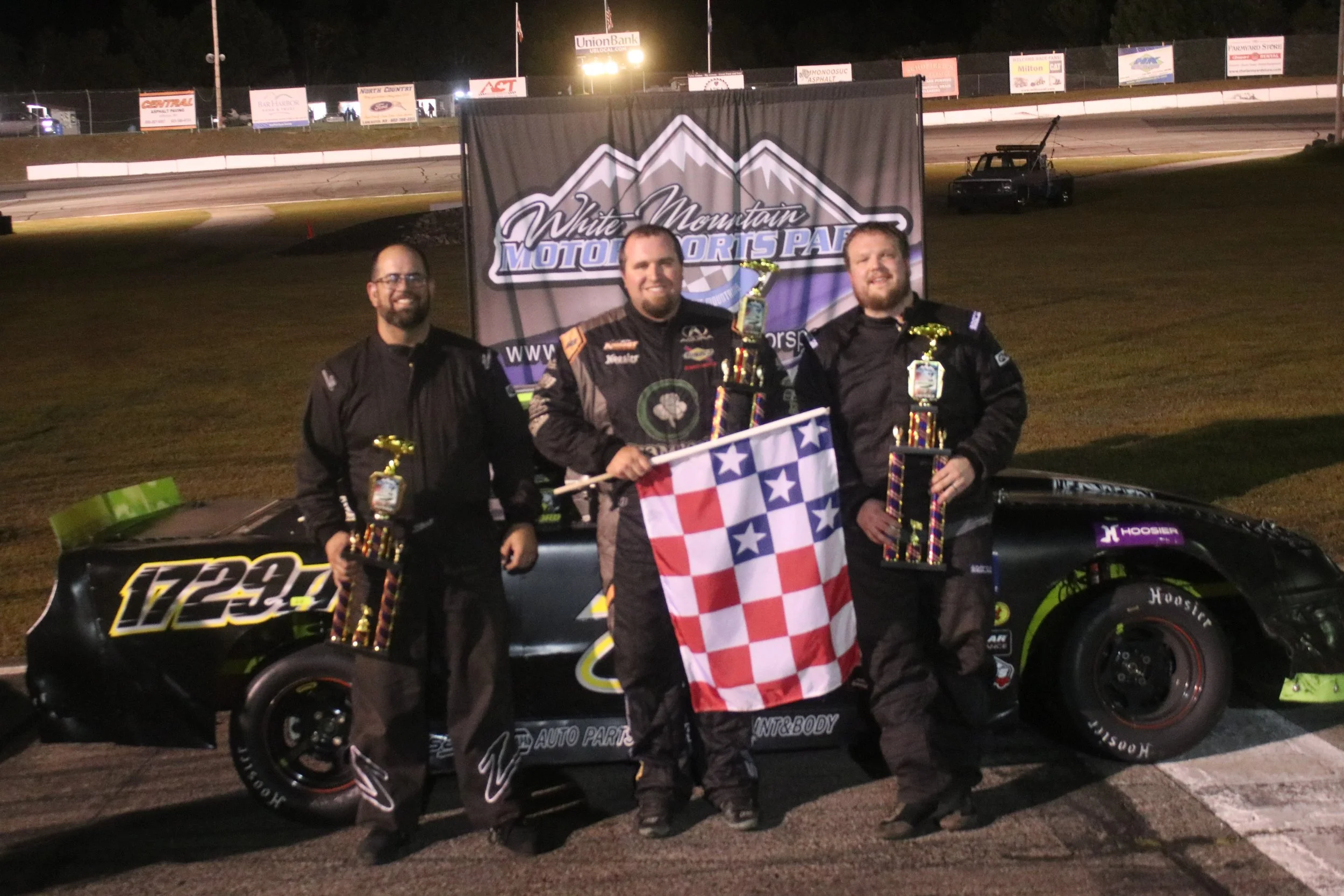 For the first half of the 1764 Sports Bar & Grill Late Model feature it was a spirited battle between Mike Jurkowski and Stacy Cahoon in a double-file fight for the ages. By the lap 29 caution for Nick Gilcris’ frontstretch spin, Richie Brown and Brian Whalley had broken into the top four runners. Brown stalked Cahoon by just inches around the White Mountain highbanks, sneaking a peek or two to the inside but the Old Man of the Mountain kept it clean and green out front to take down win number two of the 2025 season with Brown and Jaden Perry rounding out a stellar top three podium for the 1764 Sports Bar & Grill Late Models.